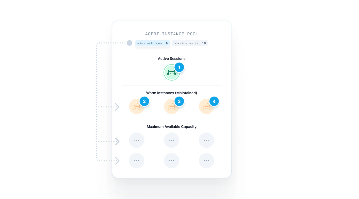 Developers specify a min-agents configuration to determines the number of agent instances that should be kept warm in their deployment pool. A warm instance is kept running and can immediately be used to serve an active session. Maintaining a minimum number of agent instances is important to keep agent start times fast and reduce cold starts.